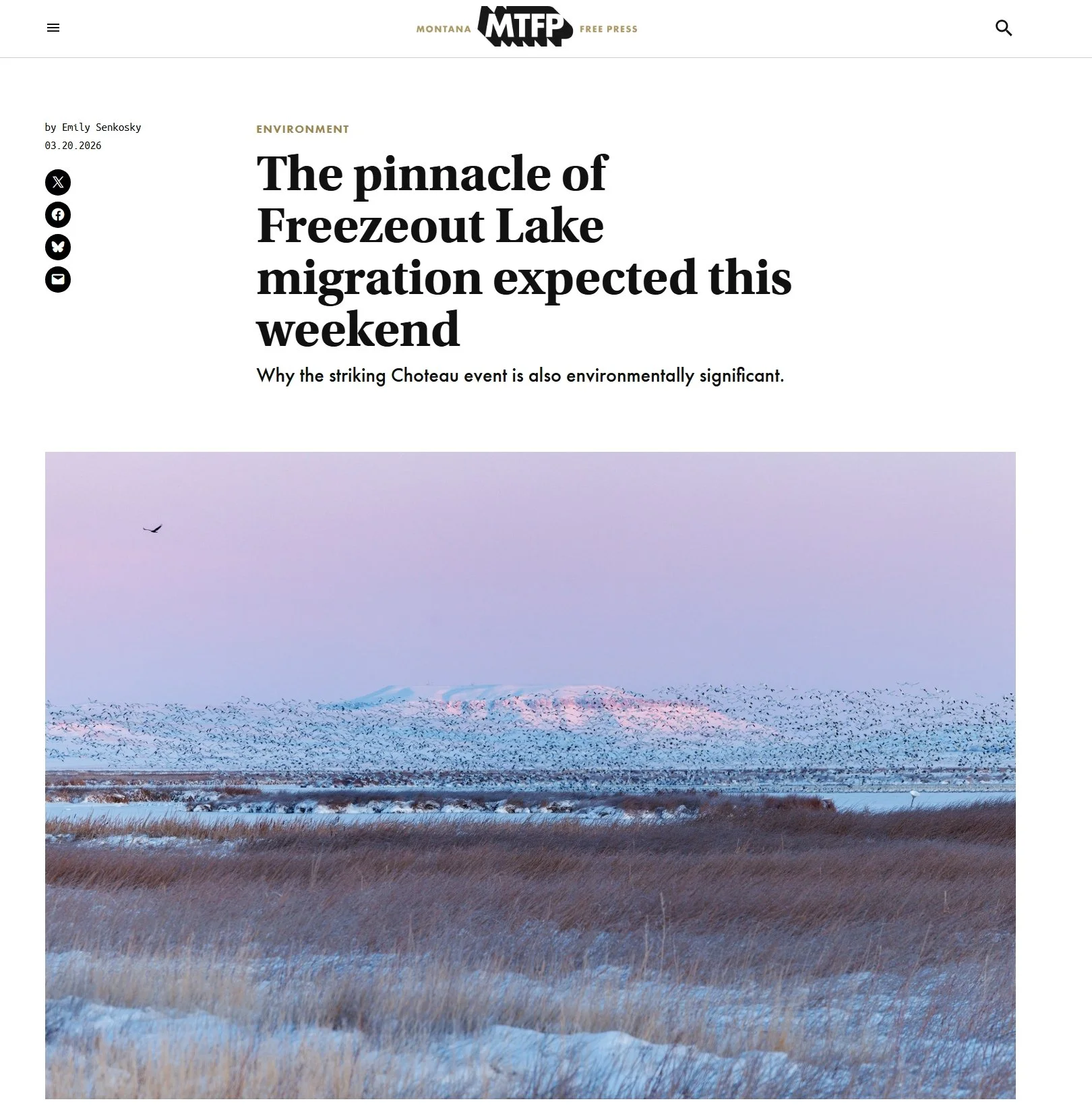 Each spring, hundreds of thousands of migratory birds converge on Freezeout Lake along Montana’s Rocky Mountain Front, drawing visitors to the growing Wild Wings Festival and providing a major boost to the local economy in Choteau. But warming temperatures, drought, and shifting conditions are already altering migration patterns and habitat, raising concerns among biologists about the future of this critical stopover along the flyway. Read more in Montana Free Press.